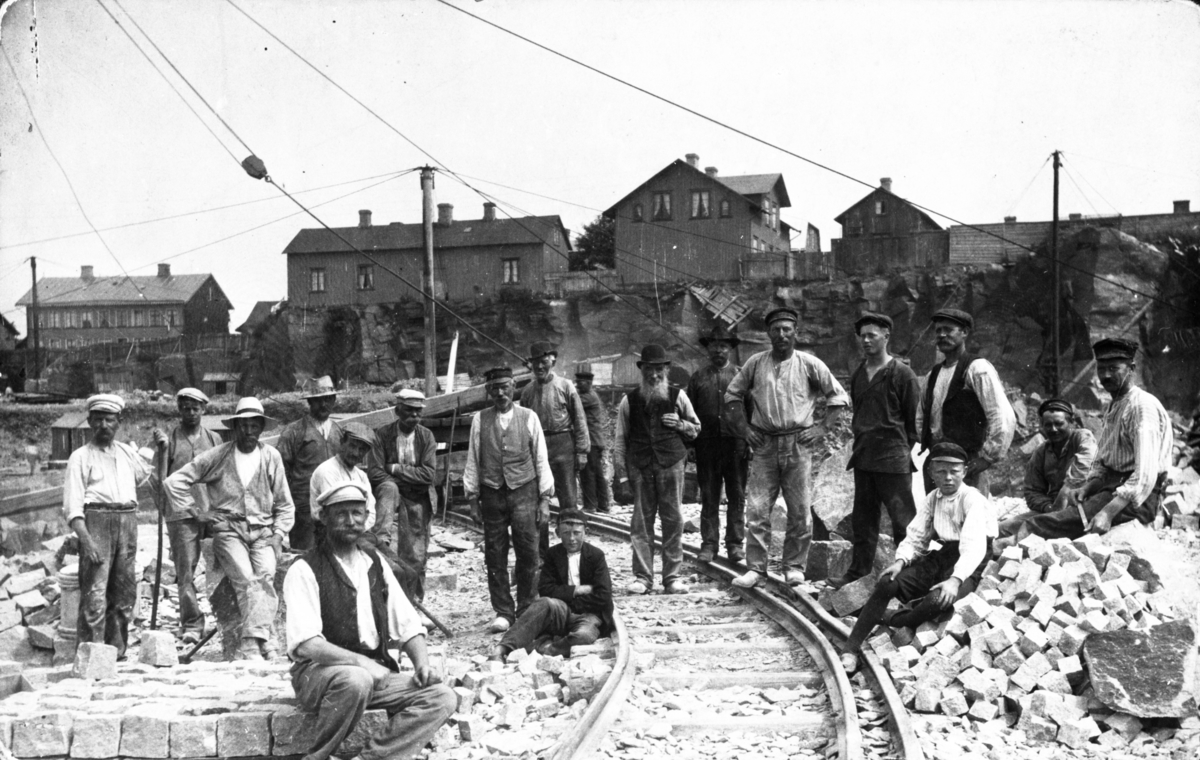 Stenbrottet vid Platsarna. Varbergs 1:a fackförening. Ett stort antal stenarbetare, även två pojkar, kring rälsen och bebyggelsen på Platsarna i bakgrunden och huggen gatsten i förgrunden.