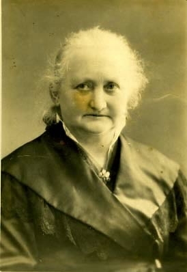 Kvinnoporträtt. Äldre kvinna med bred, blank krage och halsbrosch.