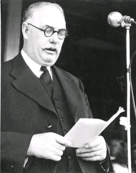 Bilder från lantbruksmötet, 1945, Påskbergsvallen. Statsrådet Axel Bramstorp högtidstalar på mötets öppnande.