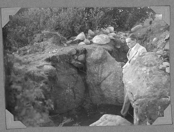 Fornlämning. Okänd man på avbildat fotografi under utgrävning av gravhög från bronsåldern i S. Vattsgård, Alfshög. I socknen finns över tio högar och många andra fornlämningar registrerade.