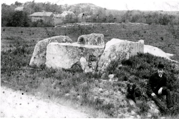 Hällkista från stenåldern, senneolitikum, kallad Dvärgahuset, i Dvärred i Lindome. På ena gavelhällen finns ett utslipat runt hål med okänd funktion och tre stora stenblock utgör gravkammarens tak. Brevid fornlämningen sitter till höger en man vid namn Olof Martin Lindbäck från Lindberg med en hund.