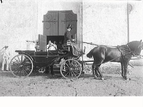 Prosten Svante Holmdahl vid kyrkportarna med sin äldsta dotter Anna, bruden, skymda av kusk och landå som väntar. Anna gifter sig med Ernst Björck. Till vänster står en man som gör honnör. (Se även bildnr MR2_1288, MR2_1296)