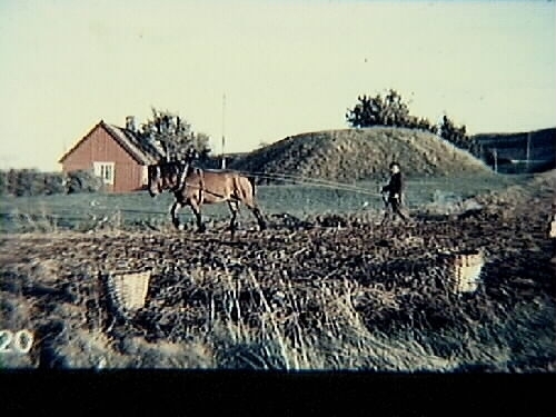 Lugnarohögen i Hasslöv, gravhög från bronsåldern invid en stuga. En man går och plöjer bakom en häst. I förgrunden står några korgar. Delvis kolorerat fotografi.