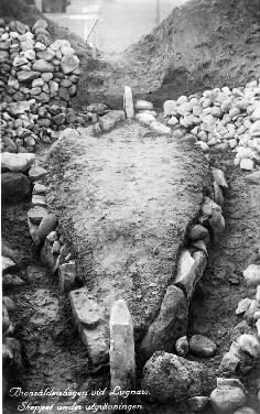 Text på bilden: "Bronsåldershögen vid Lugnaro. Skeppet under utgrävningen." I samband med utgrävningen av gravhögen 1926-1927 anlades en underjordisk gångtunnel från det angränsande torpet för att göra det möjligt att se graven inifrån. Högen är en gravhög från yngre bronsåldern och under ett röse i högens mitt hittades vid utgrävningen denna 8 meter långa stensättning i form av ett skepp. Detta var den första skeppsgravsättning i en bronsåldershög som påträffats i Sverige. Stenformationer liknande denna resta ovan jord kallas stensättningar eller skeppssättningar.