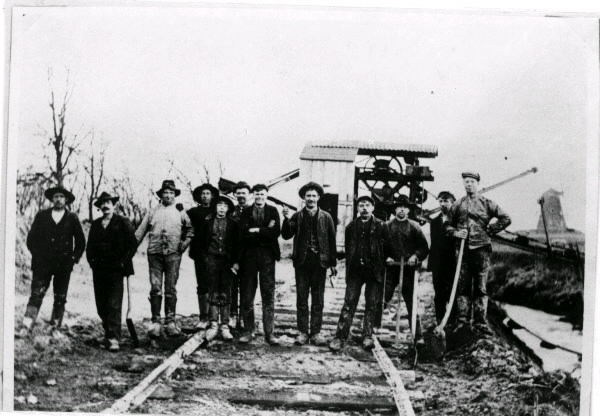 Tolv män som jobbar med utgrävningen av Ramsjökanal i Morup tar en paus för att fotograferas. De står på en räls för lastvagnar och till höger syns en väderkvarn i bakgrunden.
