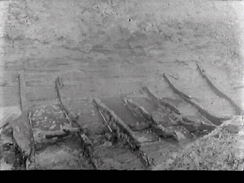 Fotografier tagna av dåvarande chefen för Varbergs museum vid utgrävningen av Galtabäcksskeppet, daterat till 1195.