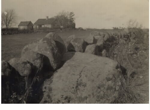 Hällristning på block i botten av gärdesgård i Grimeton. I bakgrunden ligger en gård.