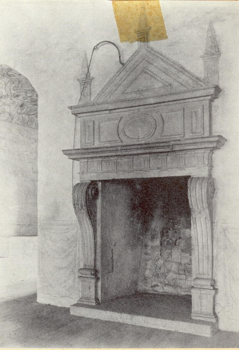 Kalmar slott, spis med omfattning av kalksten i drottningsalen (pl10 rum nr 65); huggen i Roland Mackles verkstad 1560. Det tresidiga överstycket och dess fialer övermålade med kalkfärg på väggens putsyta.