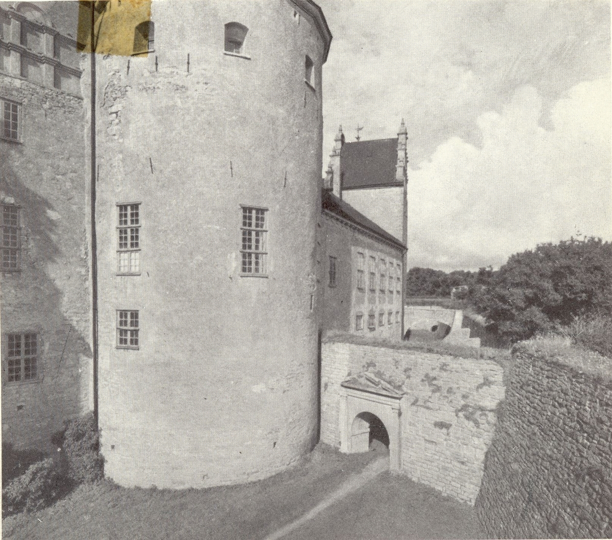 Kalmar slott, östra förborgens nordvästra del . Till vänster fångetornet; till höger förbindelsemuren mellan fångetornet och östra postejen med portalen till norra förborgen. Bakom portalen frökenrumslängan och i bakgrunden vattentornet med bron till norra vallen.