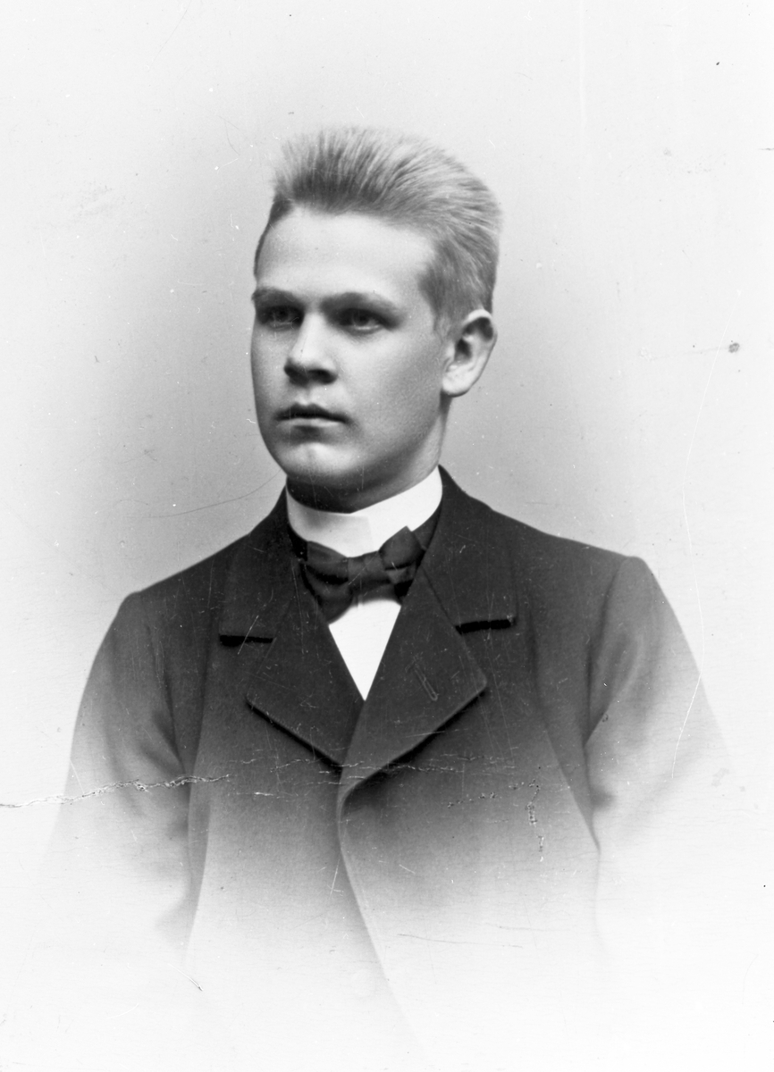 Avfotograferad gammalt poträttbild av en medleåldersman i kostym