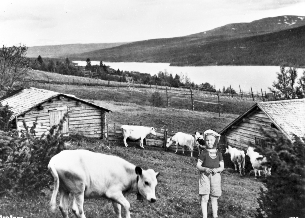 Titel: Bild från en fäbodvall med fjällkor samt ett inklippt barn i sjömansmössa