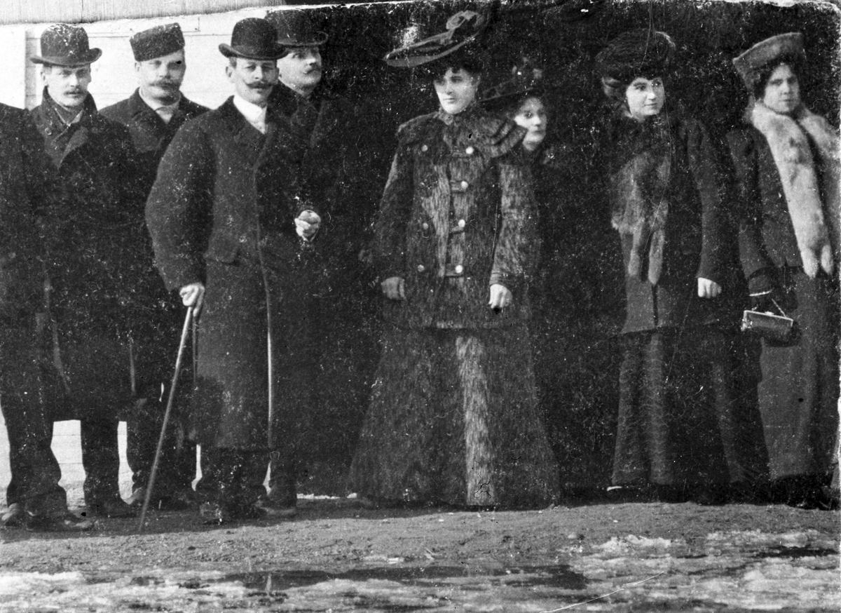 Avfotograferad äldre bild av en grupp män och kvinnor i fina vinterkappor