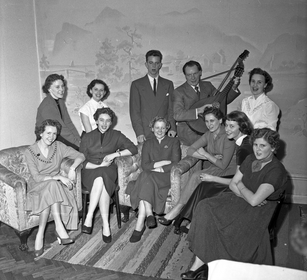 Klassfest, män och kvinnor samlade i fotöljer