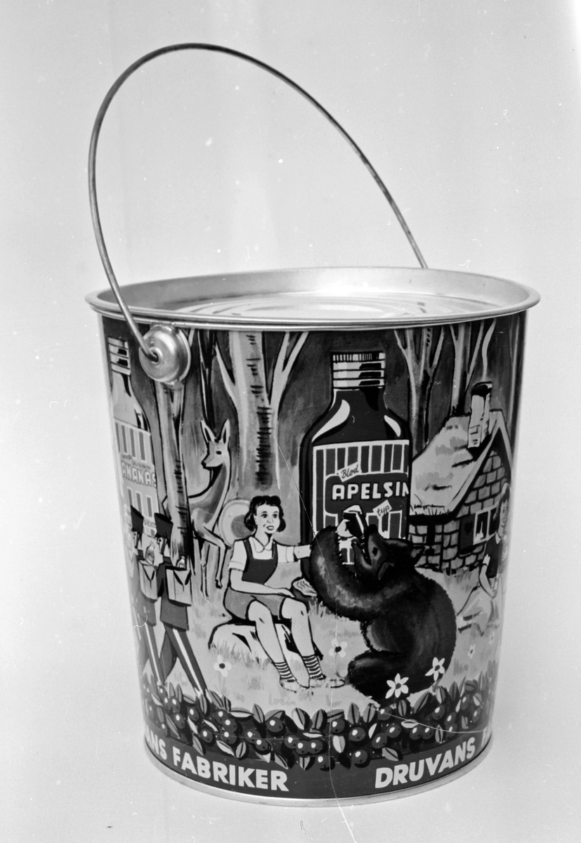 Reklambild på hink med tecknat motiv, Druvans Saftfabrik