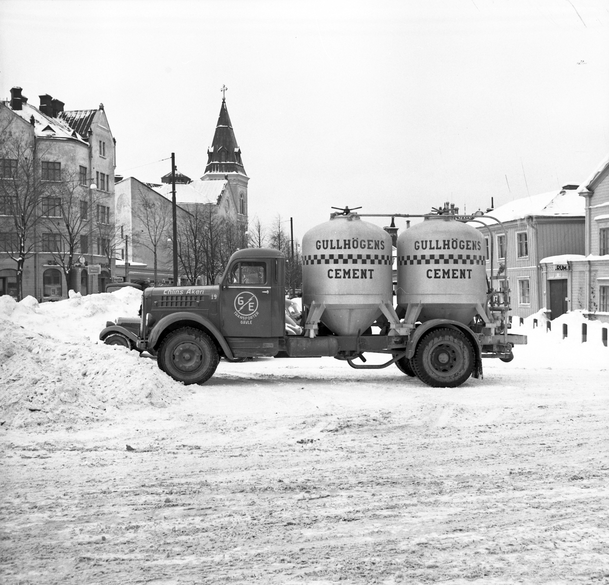 En lastbil från Gustaf Ehlins Åkeri (GE) med last från Gullhögens Cement