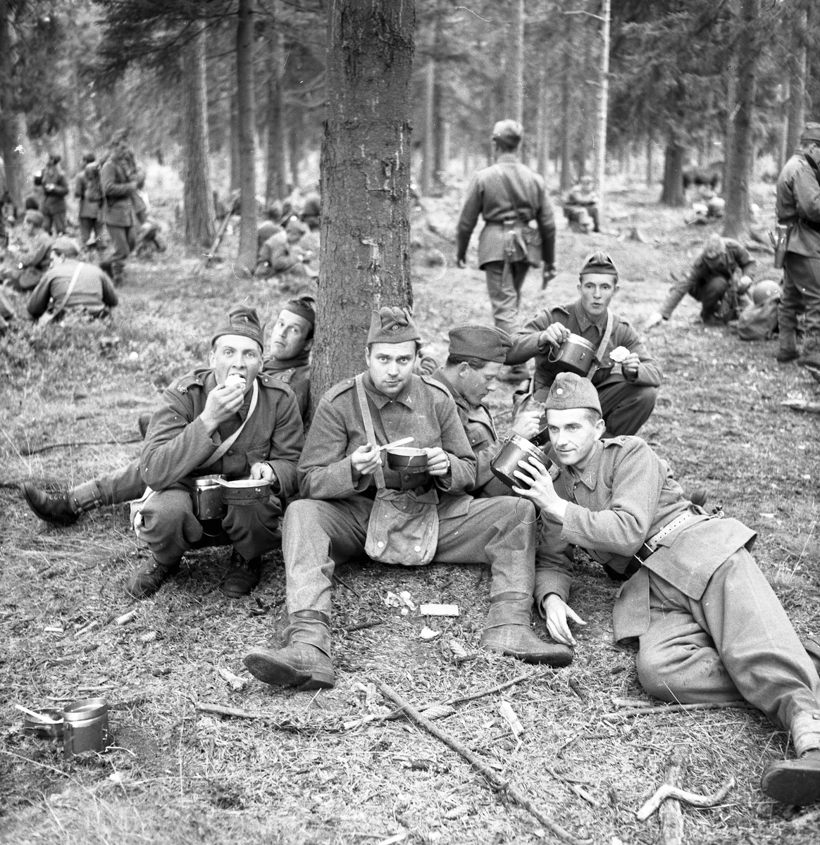 Sex soldater från Hälsinge Regemente, I 14, samlade runt en gran under en måltid