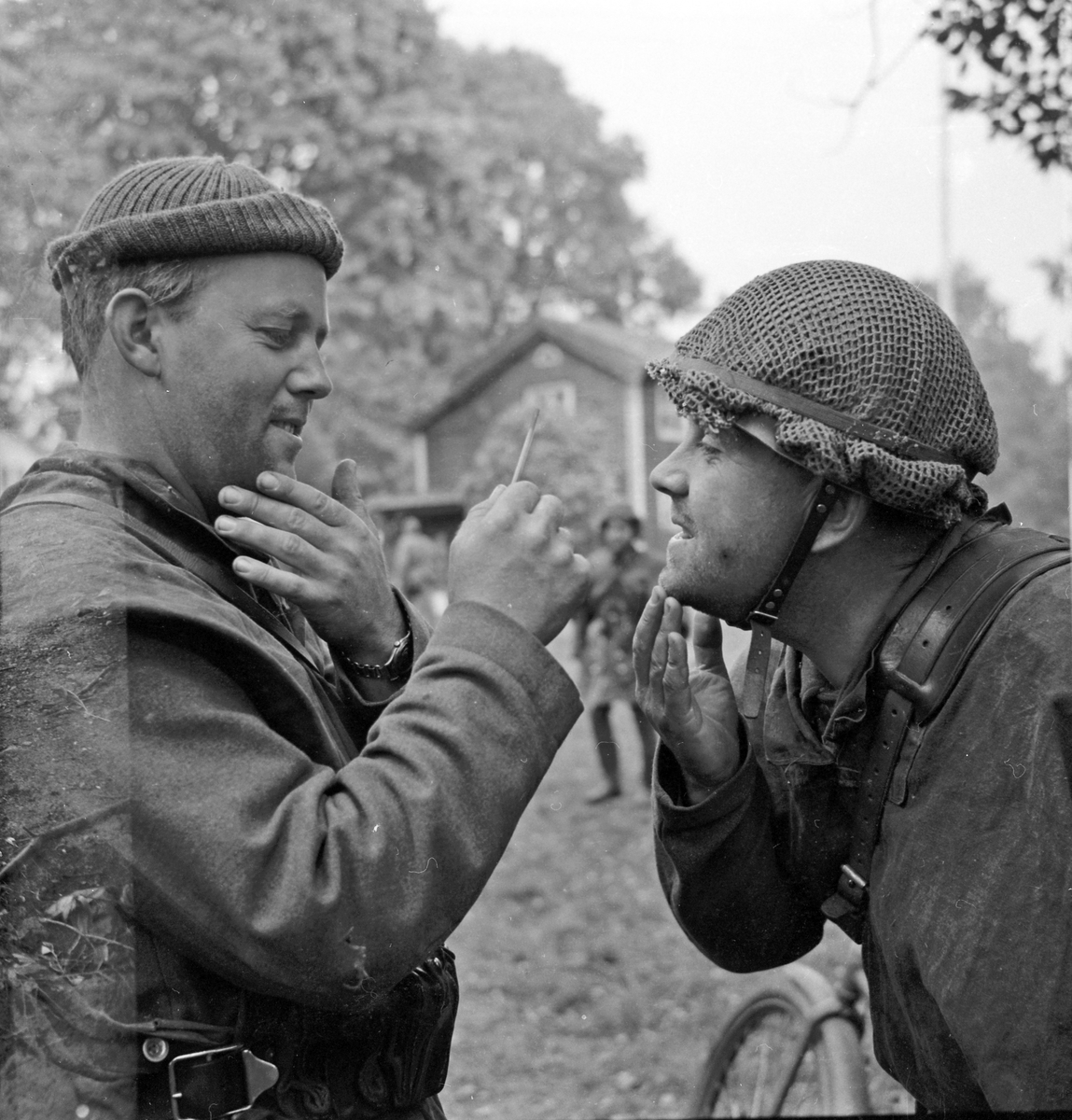 Två soldater från Hälsinge Regemente, I 14, inspekterar sig själva i en fickspegel