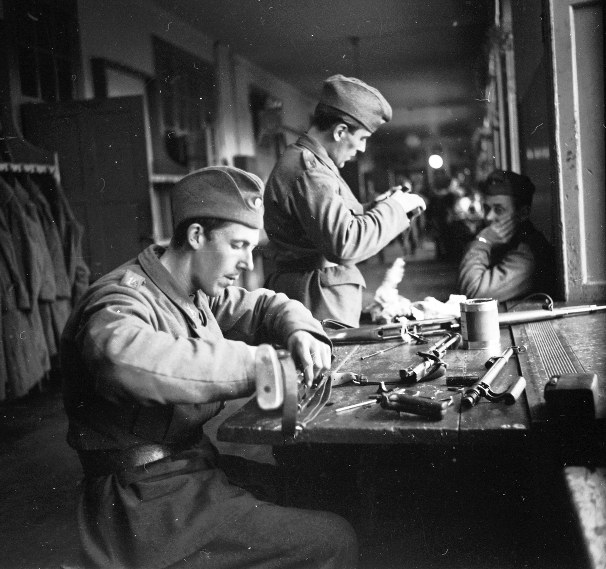 Tre soldater från Hälsinge Regemente, I 14, utövar vapenvård