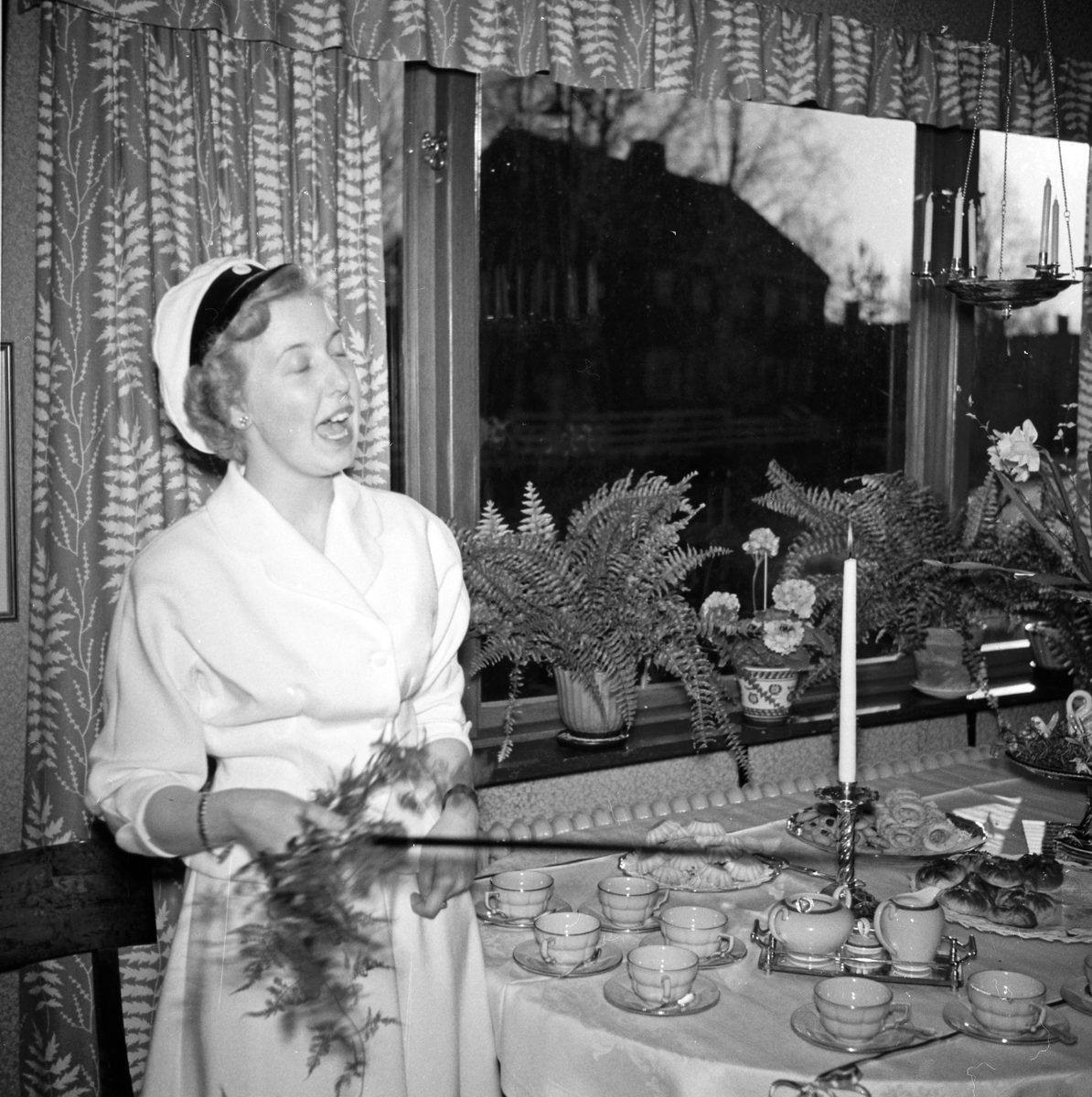 Kvinnlig student i hemmet poserar med sin ridpiska framför ett uppdukat fikabord