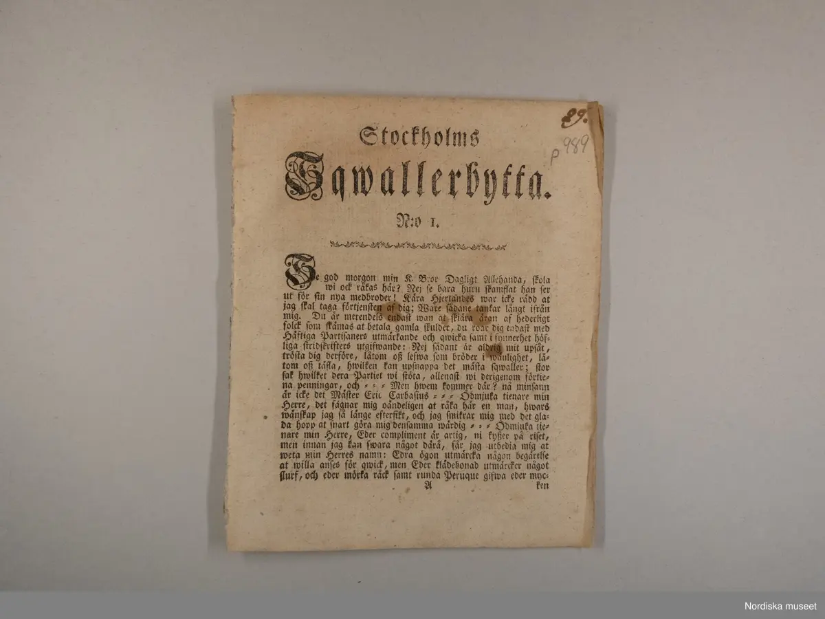 Tidning. Stockholms Sqwallerbytta N:o 1 och 2. Tryckt hos Wennberg och Nordström år 1772.