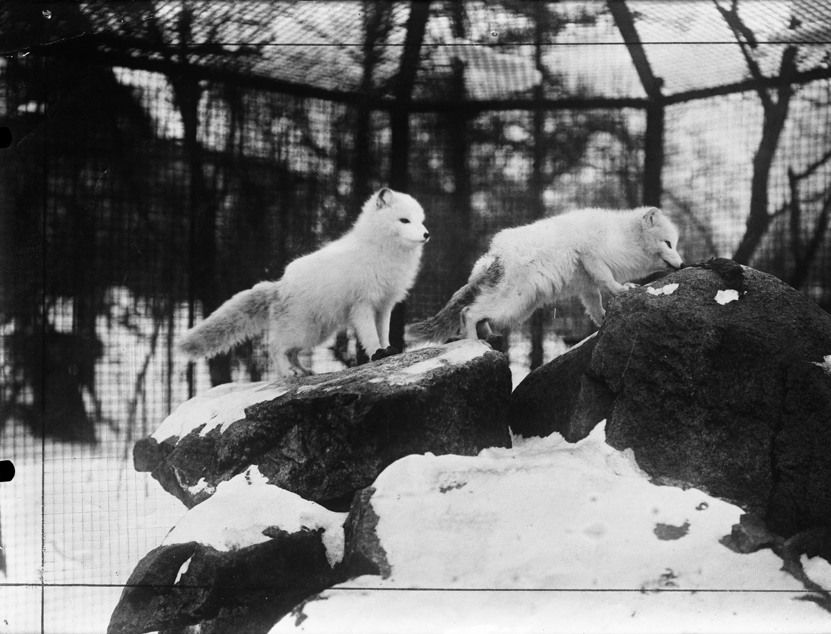 Skansen. Fjällrävar i hägn på de snöklädda klipporna.