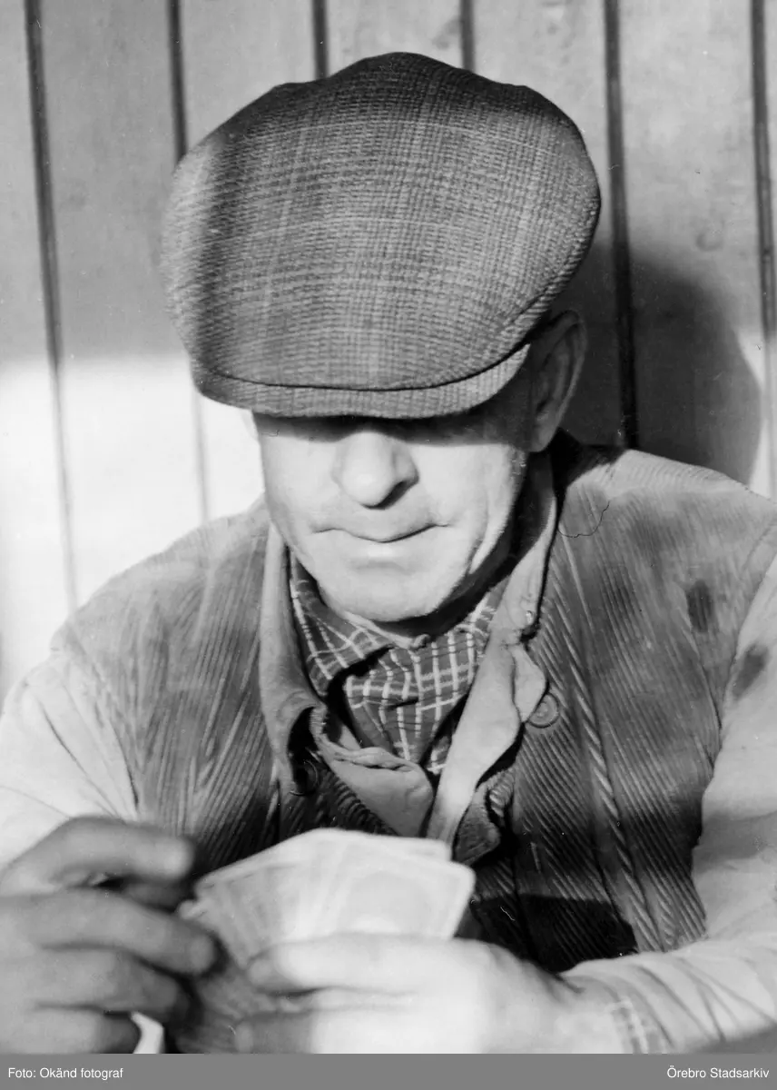 Banarbetaren Kalle Edlund spelar kort på rasten, 1950-tal