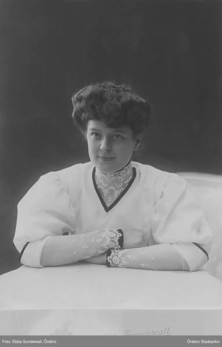 Porträtt av kvinna i vit blus med spetsärmar, 1900-tal