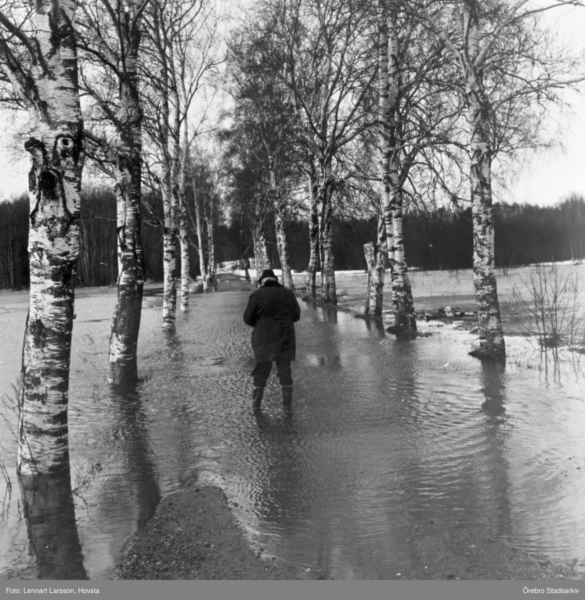 Erik Hedberg går på översvämmad väg i Ervalla, 1977