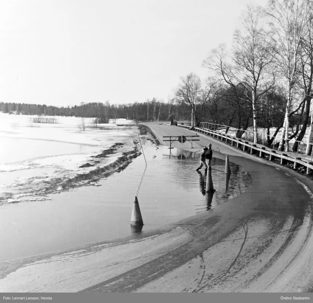 Barn leker på översvämmad väg i Ervalla, 1977