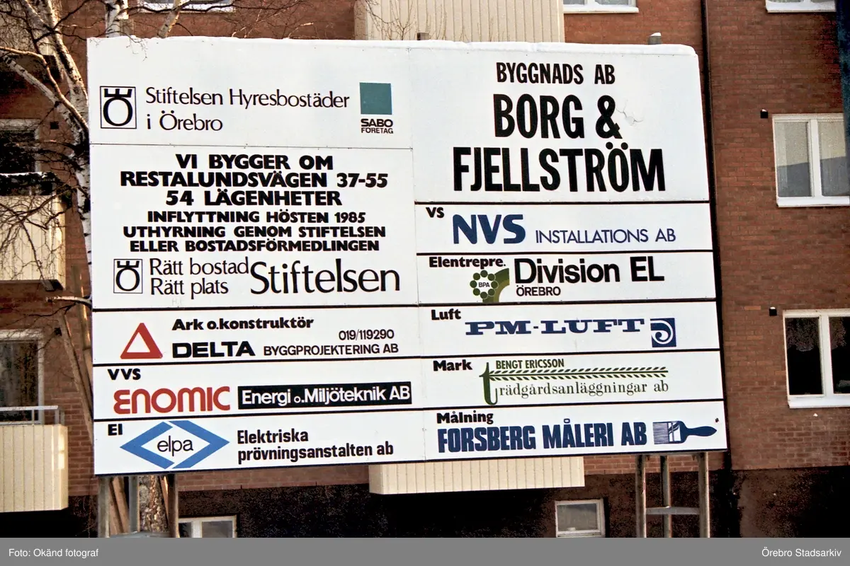 Entreprenörsskyltar vid Restalundsvägen, 1985