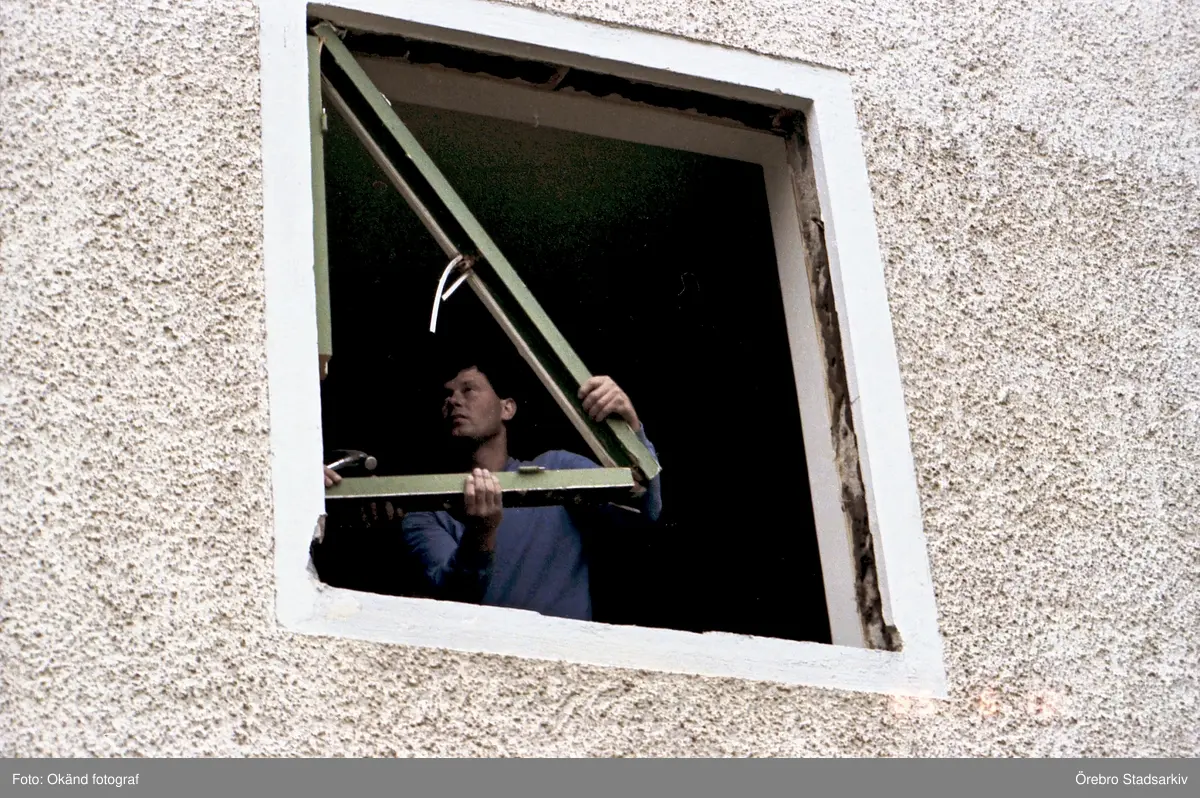Fönsterkarm lyfts bort i Stjärnhusen, 1985-06-12