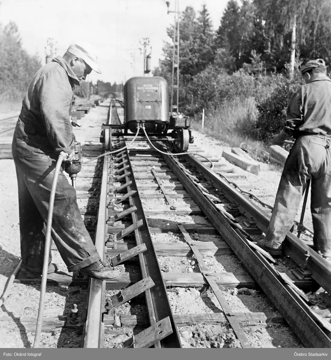 Banarbetare jobbar med rälsbyte och makadamisering, 1950-tal