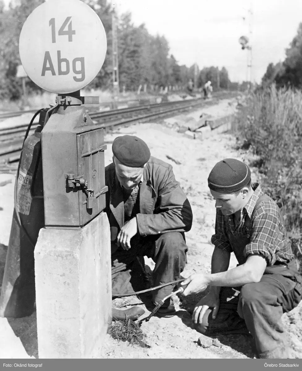 Banarbetare Boman och Ellgren felsöker en växel, 1950-tal