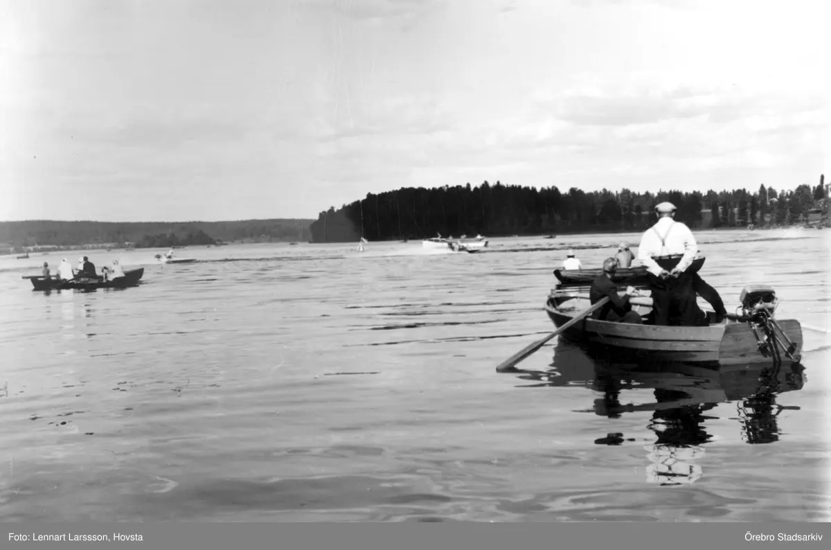Flera ekor med åskådare vid båttävling på Norasjön, 1949