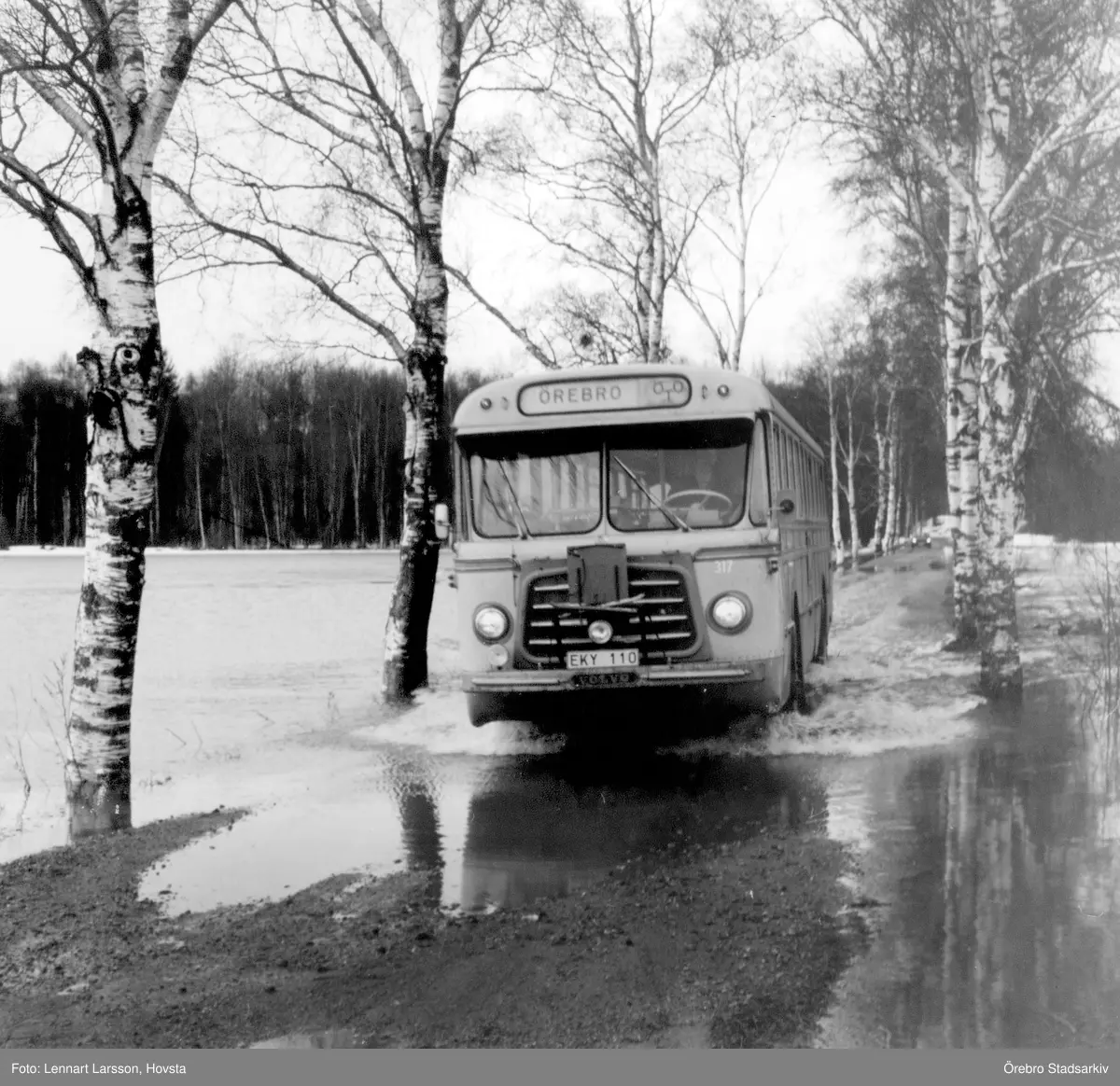 Buss på väg mot Örebro kör på översvämmad väg i Ervalla, 1977