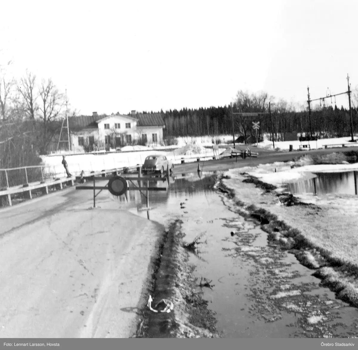Bil kör förbi stoppskylt vid översvämning i Ervalla, 1977