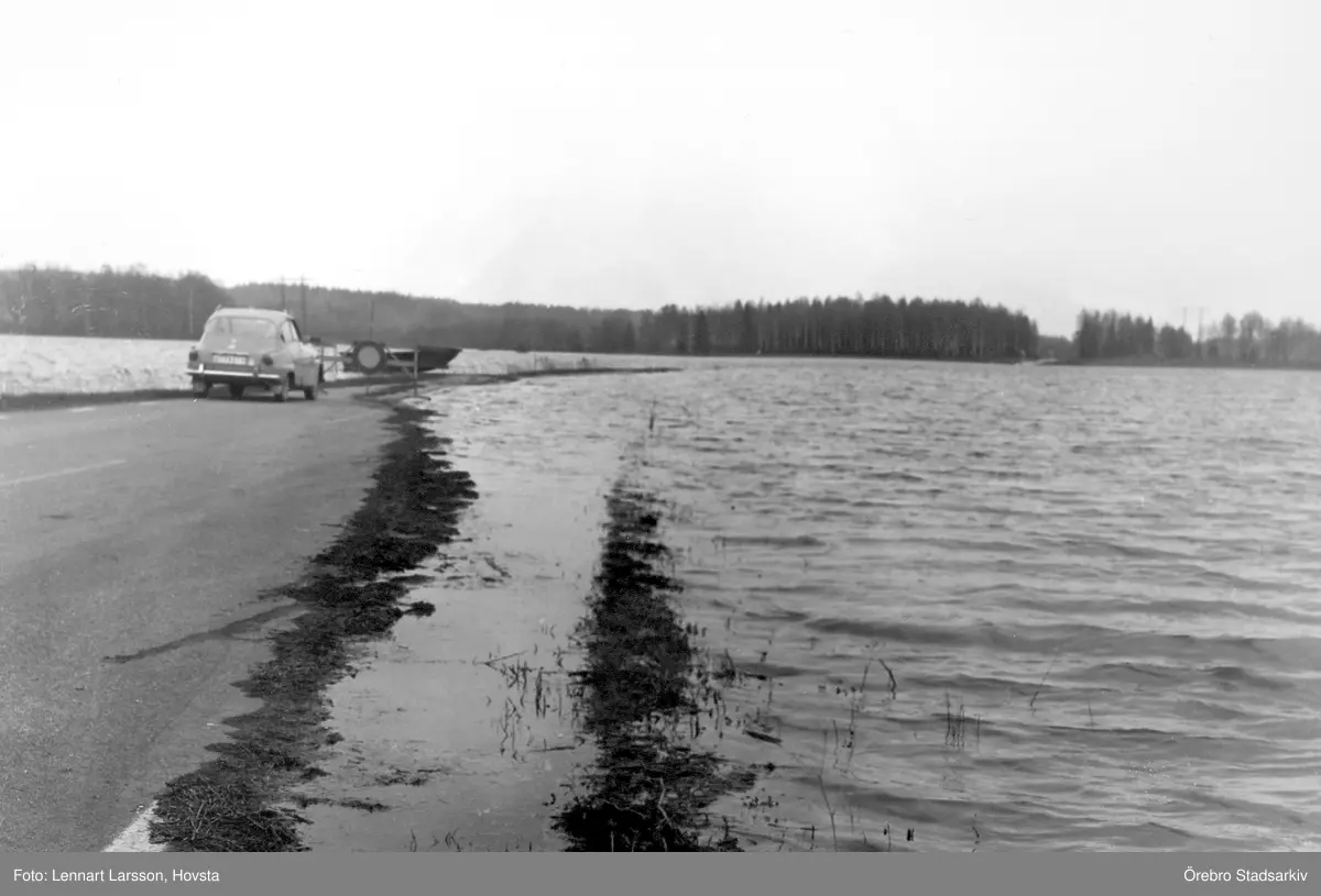Bil vid stoppskylt vid översvämning i Ervalla,, 1977