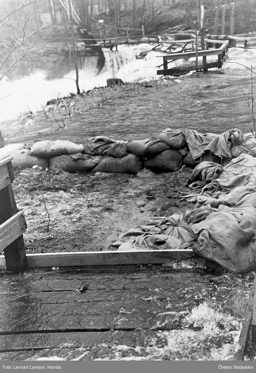Säckar utlagda för att stoppa översvämning i Hammarby i Nora, 1977