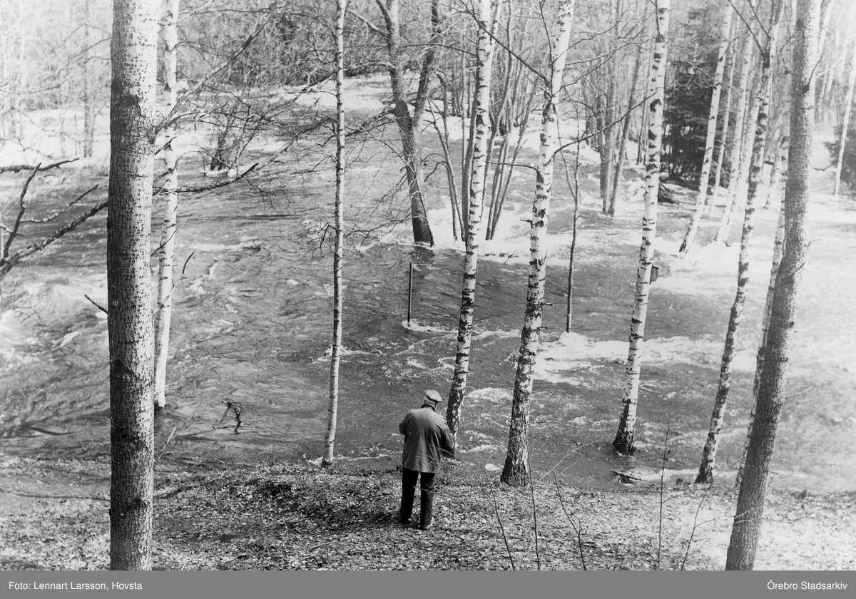 Erik Hedberg tittar på vårflodens översvämning i Järle i Ervalla, 1977