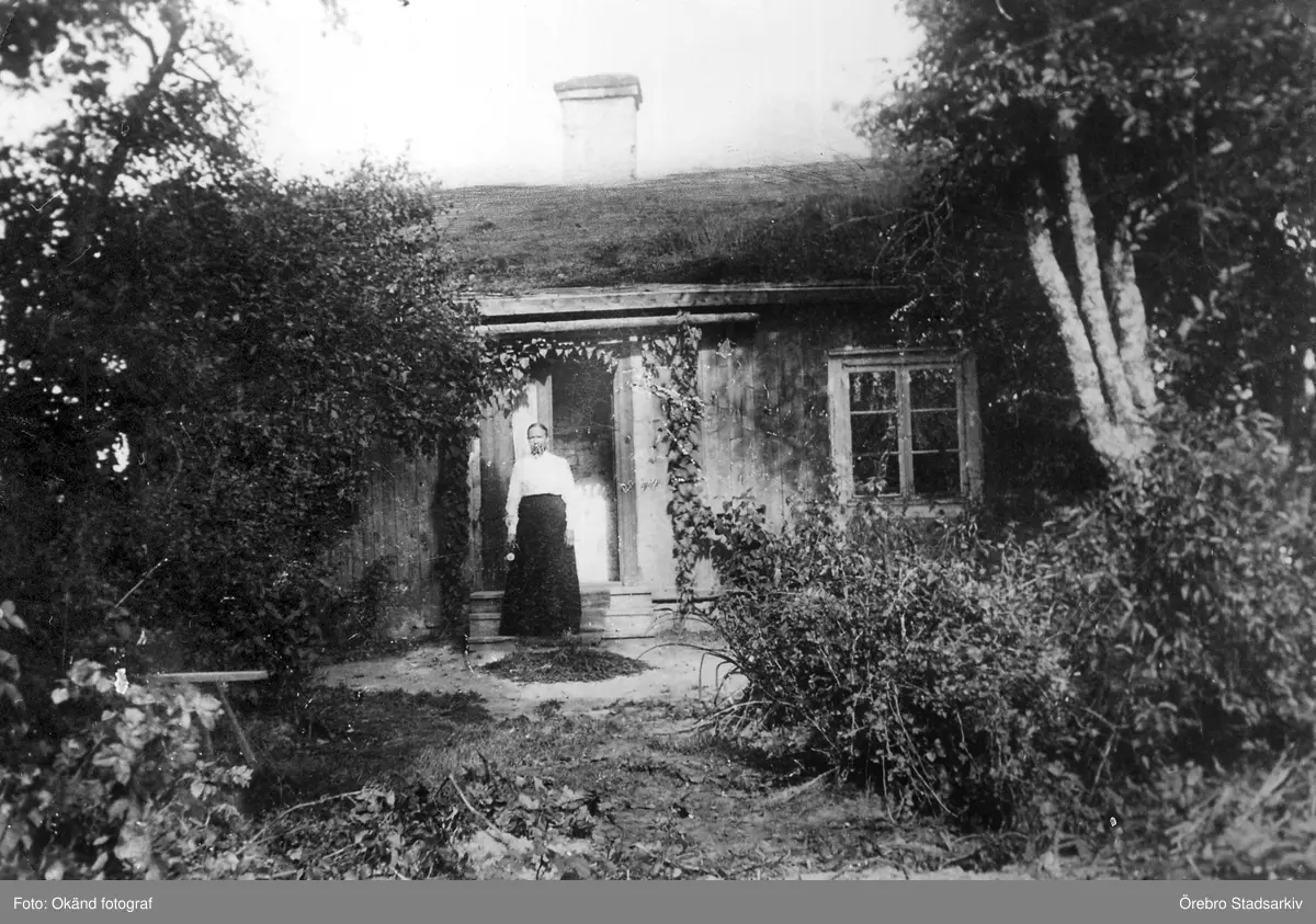 Kvinna framför hus i Yxtabacken i Hovsta, ca 1900