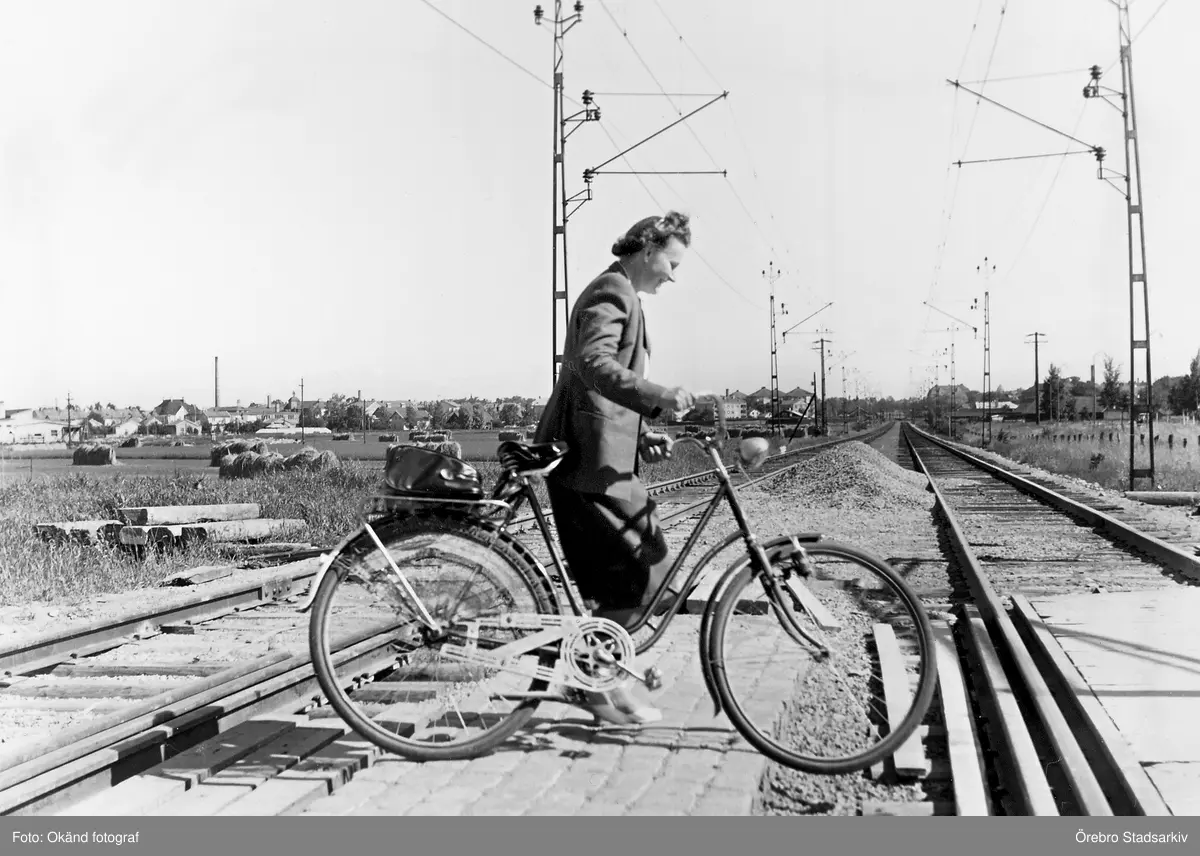 Kvinna med cykel vid övergång vid Gustavsvik, 1950-tal