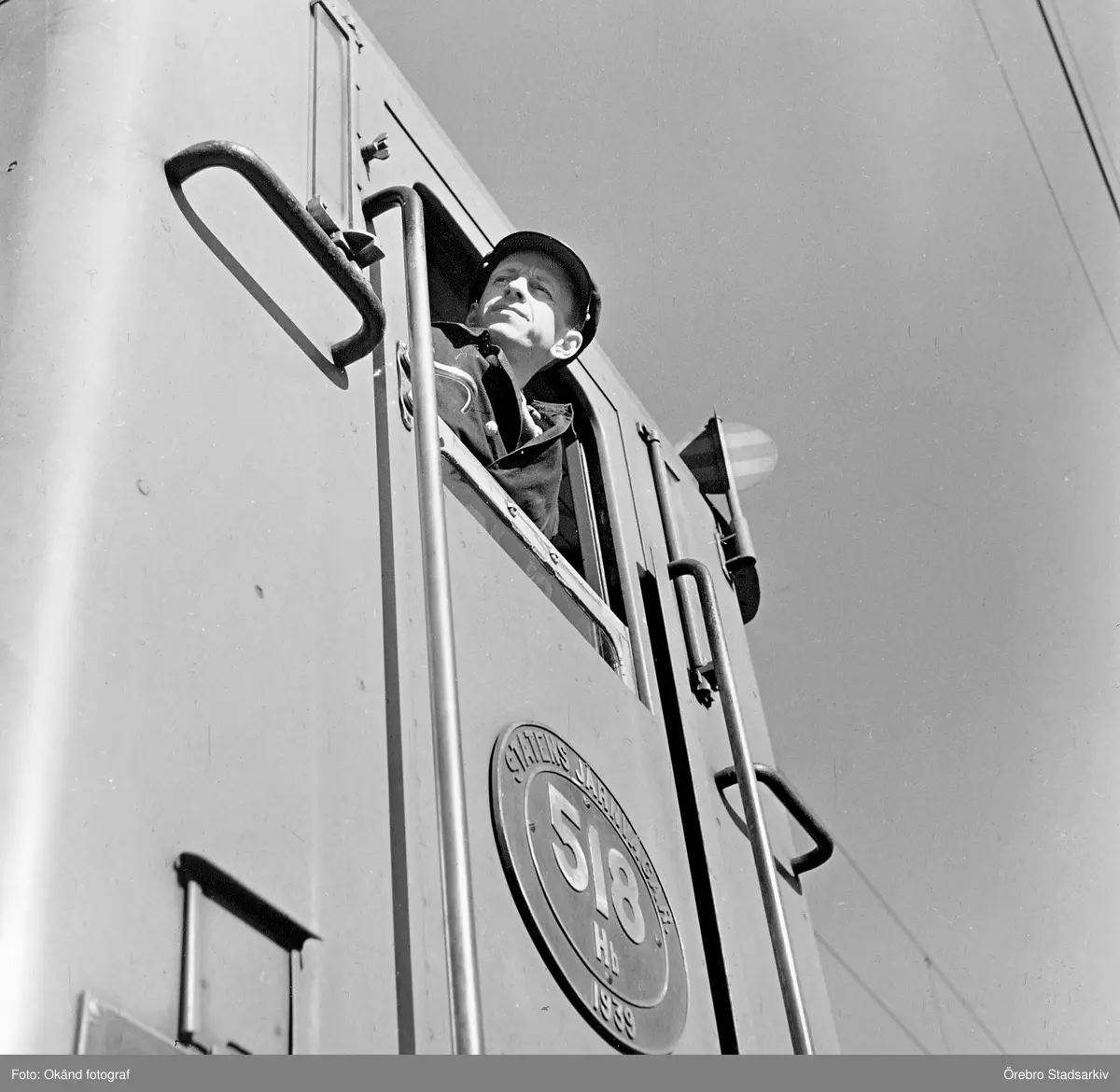 Lokförare Börje Larsson i lokfönstret, 1950-tal