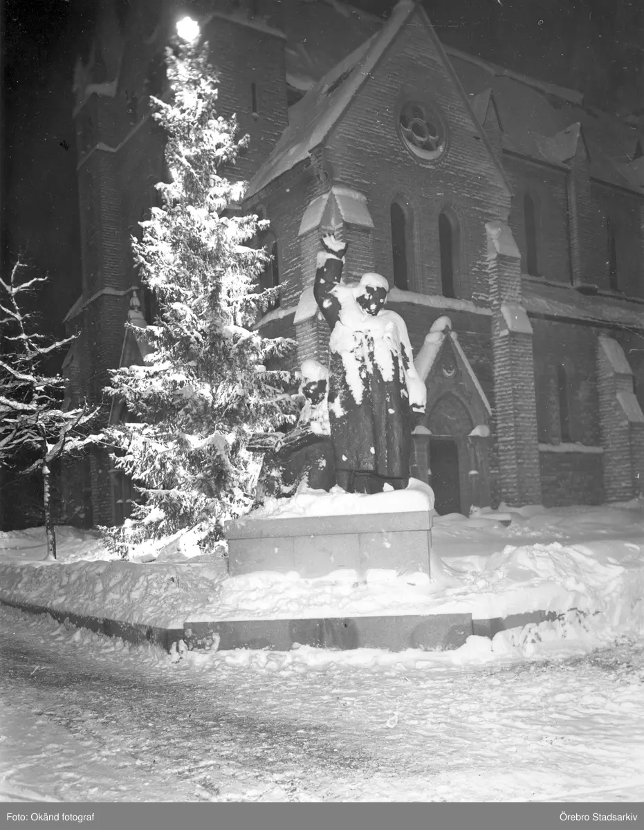 Julgran bredvid bröderna Petris staty vid Olaus Petrikyrkan, 1930 ca