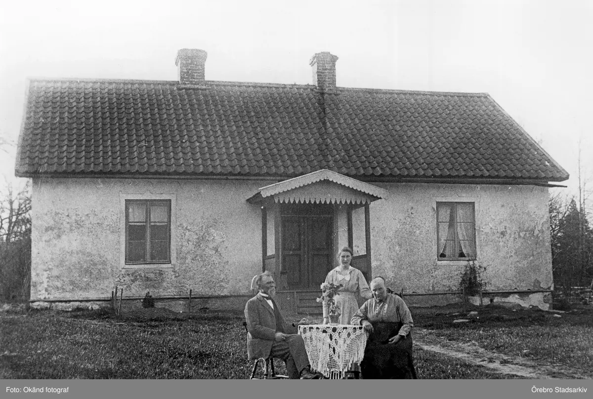 Familjen Larsson framför hus i Skråmsta i Adolfsberg, ca 1915