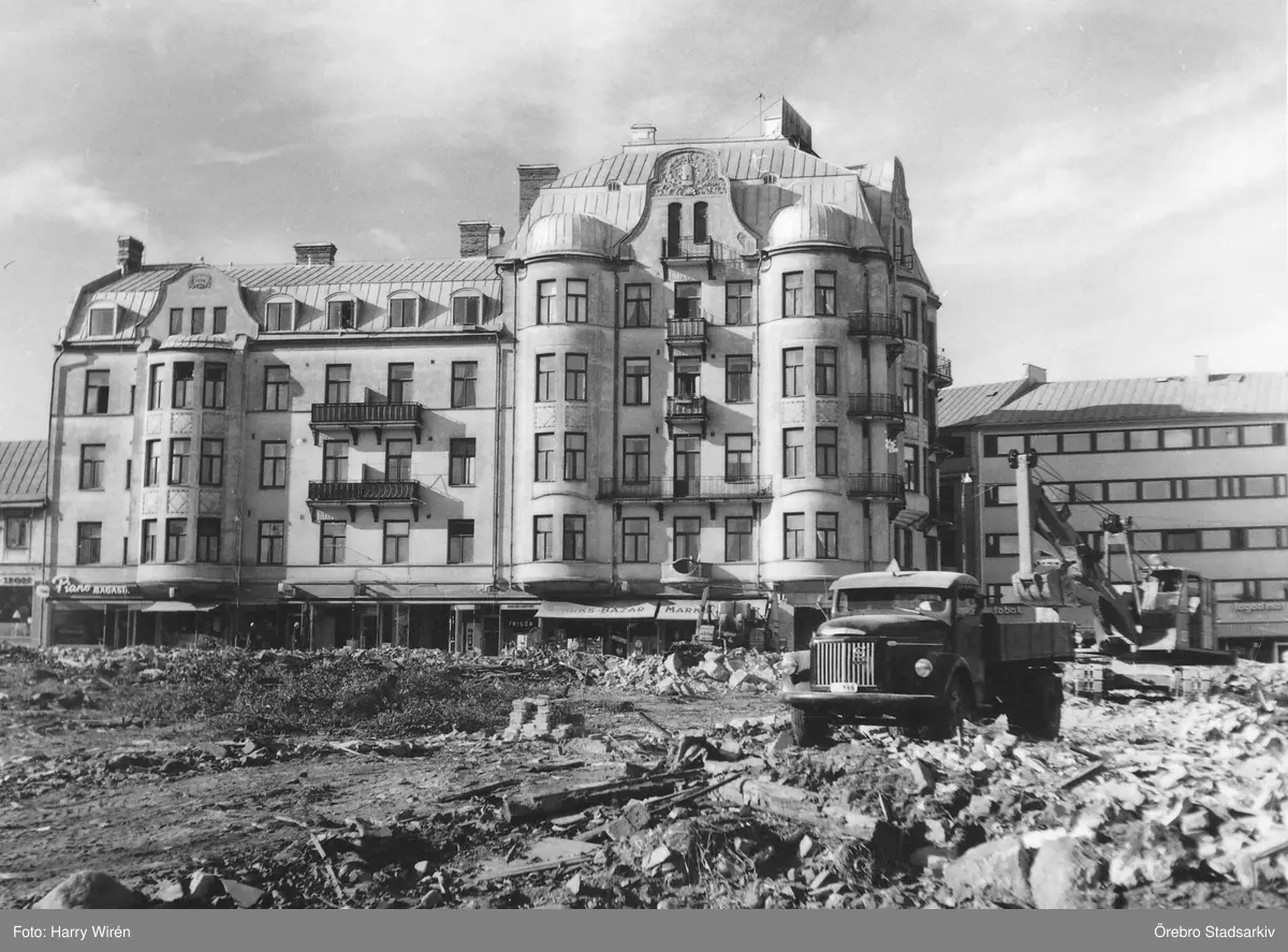 Näbbtorgshuset reser sig under förberedelser för byggnation av Krämaren, 1959