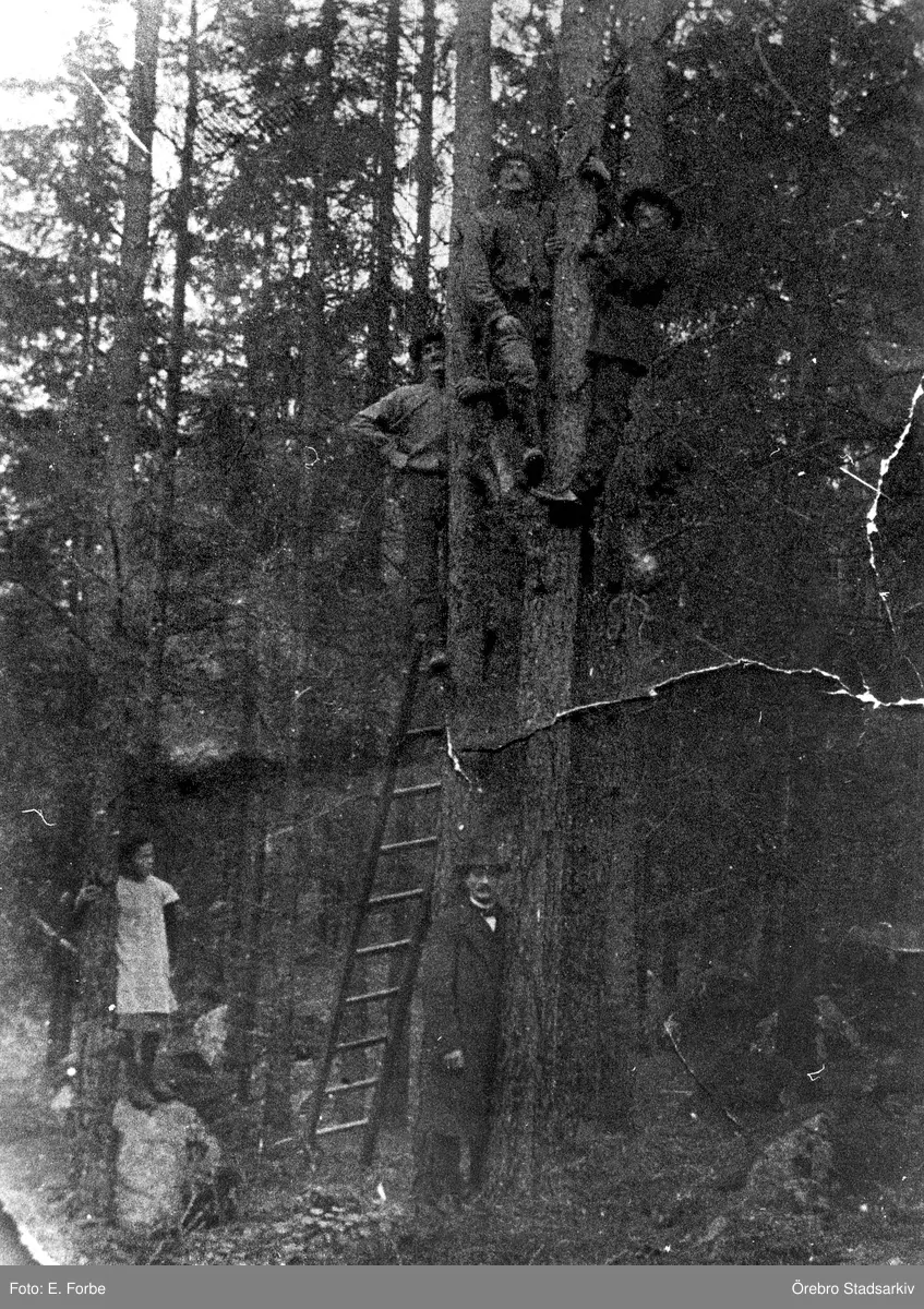 Linus, Joel och Pär klättrar i ihopväxta tallstammar i Yxta skogen i Hovsta, 1917 ca