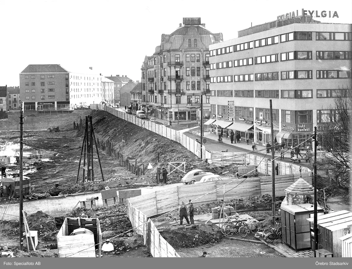 Näbbhuset och Fylgia-huset vid sidan av grundarbete av Krämaren och Rudbeckstunneln, 1960-03-21