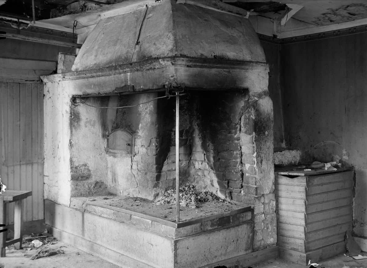 Köksspisen i Bärbystugan, på urpsrunglig plats i Bärby, Östervåla socken, Uppland 1928 - 1929