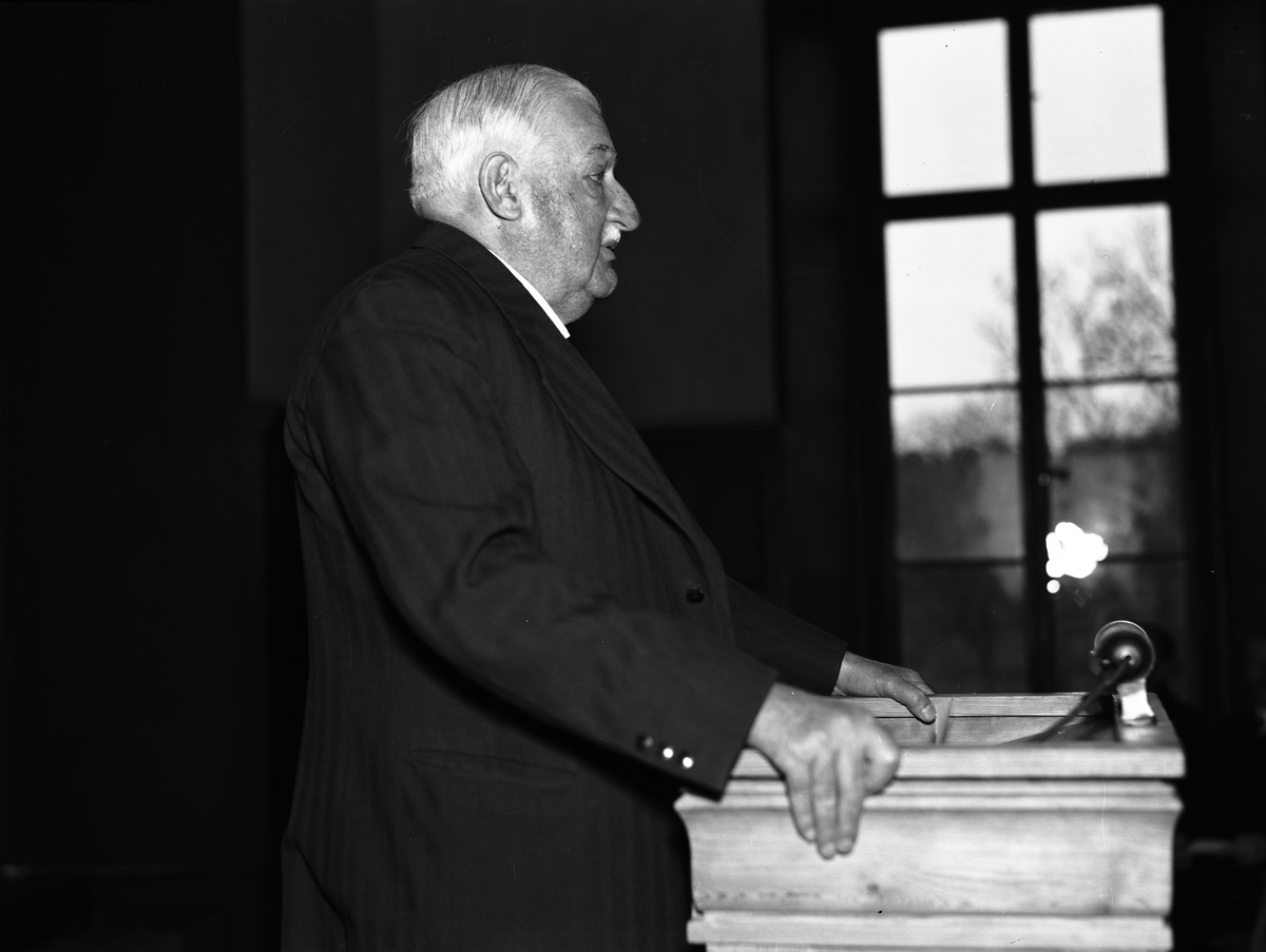 "Elevhemsinvigning på Wiks folkhögskola", Balingsta socken, Uppland 1943 - redaktör Axel Johansson i talarstolen