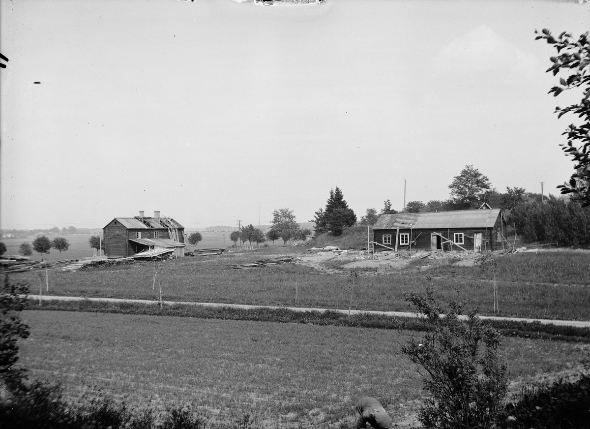 Bärbystugan och Nyvlastugan på friluftsmuseet Disagården, Gamla Uppsala under återuppförande midsommar 1929
